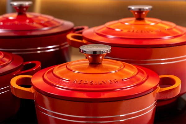 A primeira impressão que as panelas da linha Supreme da Redsilver causam é o design sofisticado. Com cores vibrantes, como o vermelho e laranja em efeito degradê, essas panelas possuem um acabamento cromado que agrega um toque de elegância e modernidade à sua cozinha. São panelas que não só cozinham bem, mas também decoram o ambiente, conferindo um charme extra ao espaço.